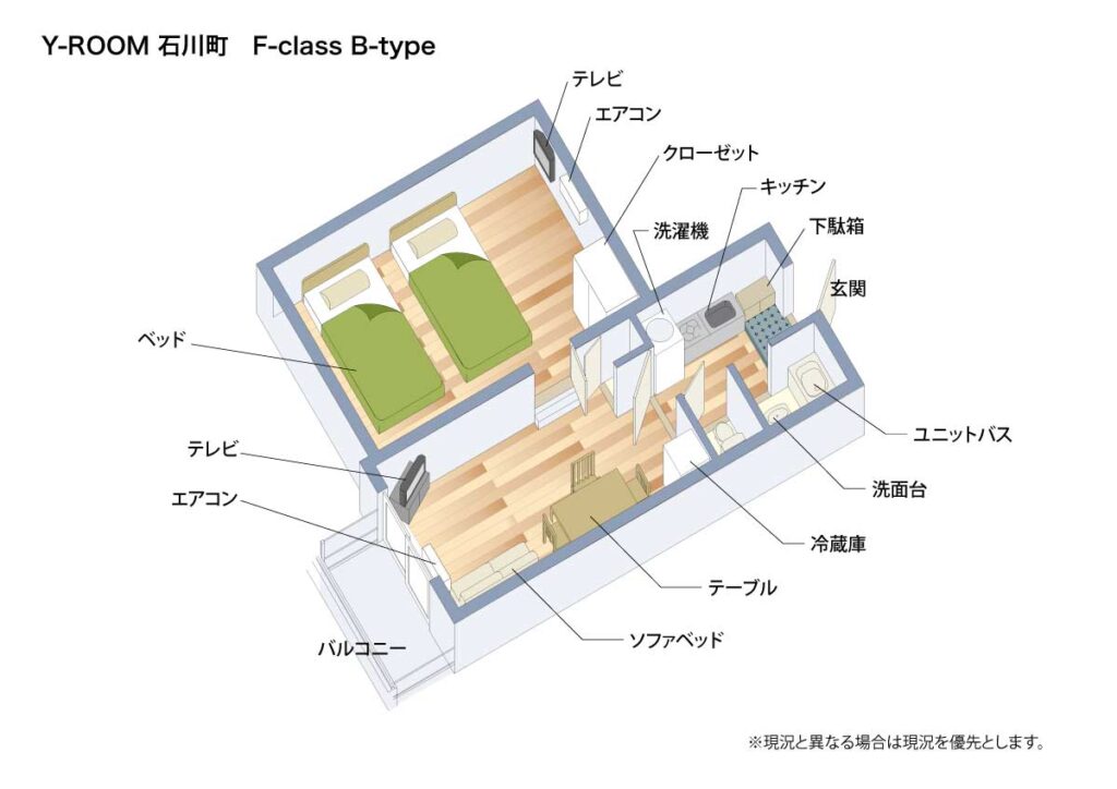 - 寝室とリビングが分かれたこの間取り(2K)のお部屋タイプは1室のみで、他は広い1Kタイプとなる F-class A-type のお部屋か、S-class のシングルルームです。(※上記室内写真は、F-class A-type です。詳しくはお問い合わせ下さい。)